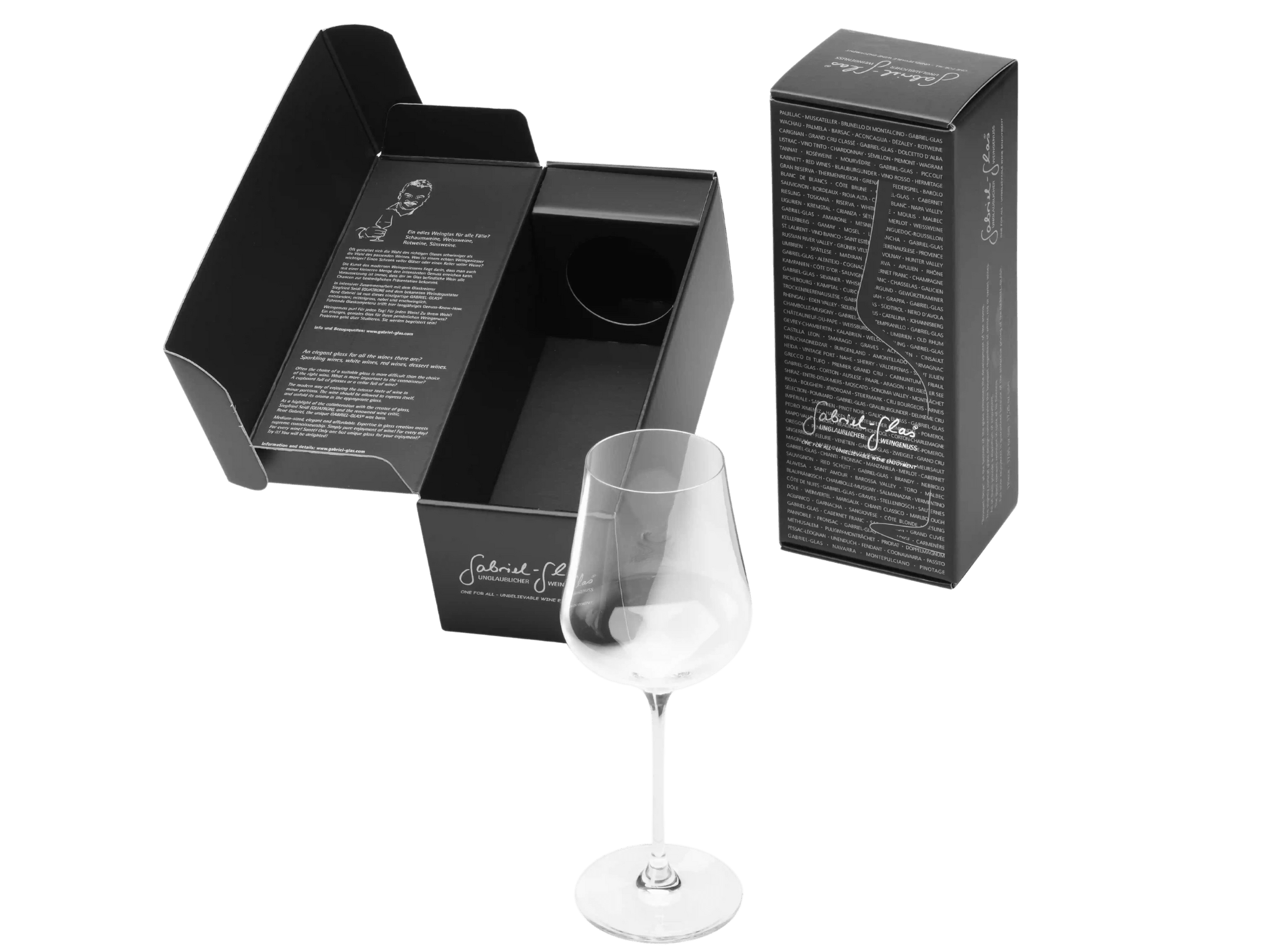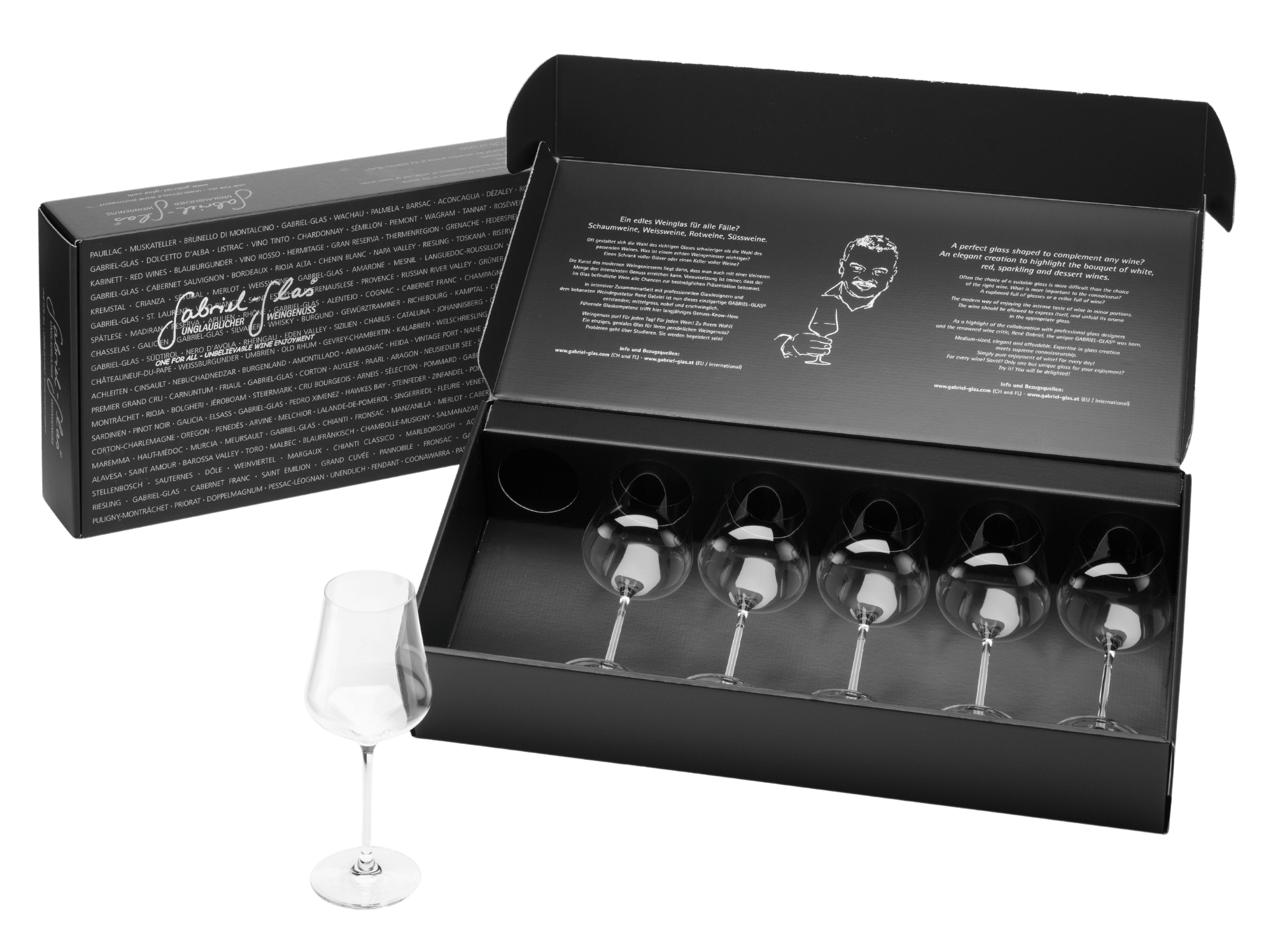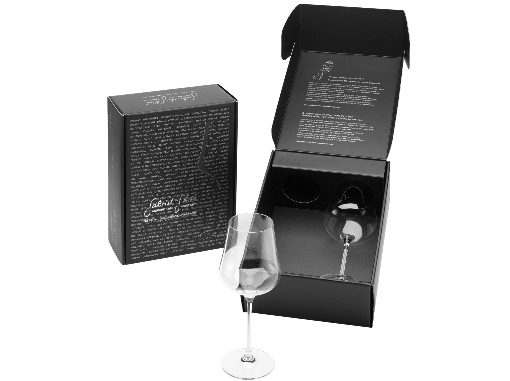 Beim Gabriel-Glas handelt es sich um ein Universal-Glas. Es wurde mit viel Know-how konzipiert, um ein perfektes Glas für jeden Weintyp zu schaffen. Egal ob Weiß-, Rot- oder Rosé-Weine, im Gabriel-Glas kommen sie alle zur Geltung. Das liegt an der speziellen Form des Glases. Der untere, bauchige Teil ist leicht V-Förmig. Dies in Kombination mit einer leicht konischen, nach innen geschwungenen Form, ähnlich eines Trichters, transportiert die Aromen optimal zur Nase. Auch für Schaumweine ist das Glas gut geeignet, da es einen Moussierpunkt besitzt.